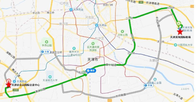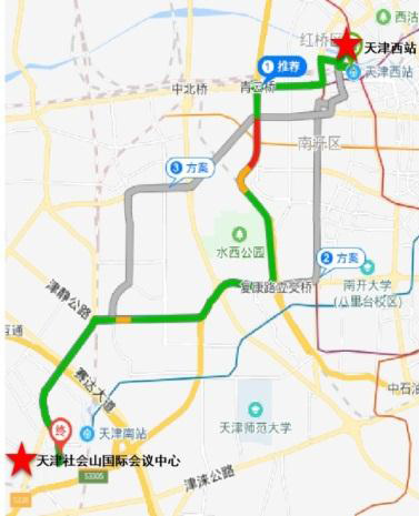 . 天津西站:(1)可乘地铁 6号线至红旗南路站,于津南站公交 转758 路、 674 路或 707 路至社会山中心站,步行 500 米到达酒店;( 2) 乘坐出租车约需 60元。