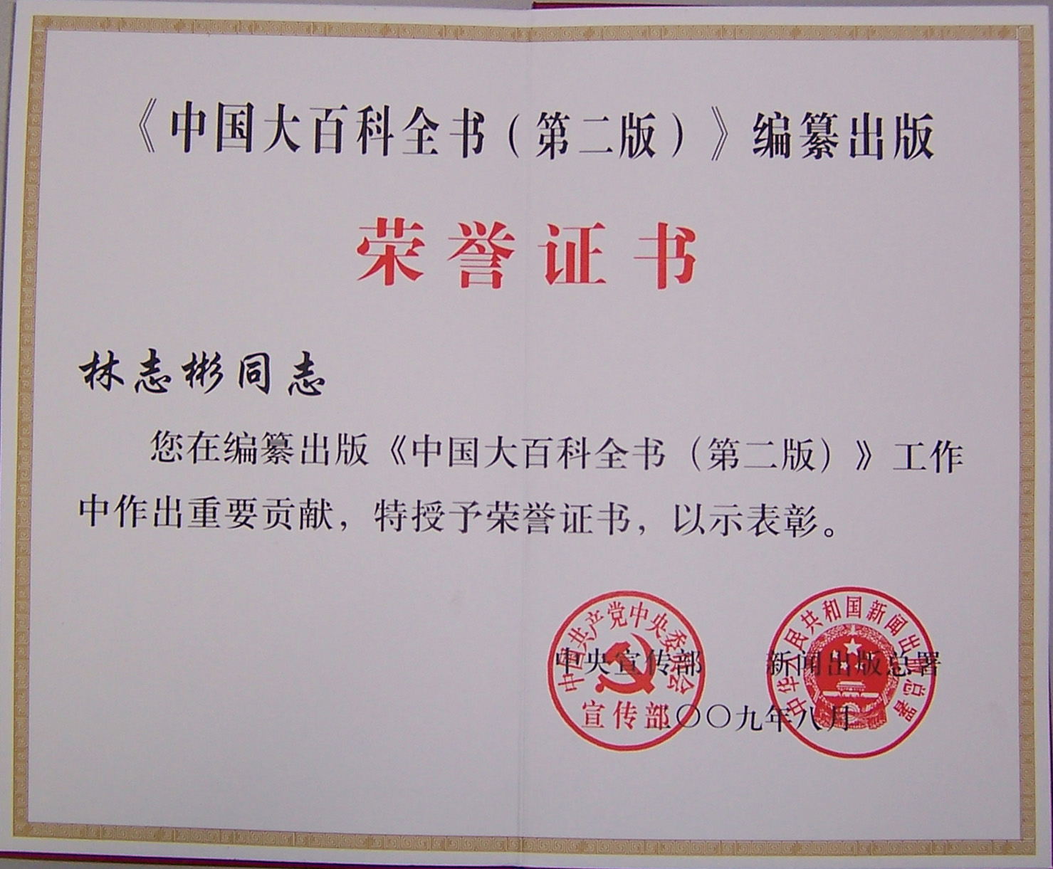 鏃ュ墠锛屼负琛ㄥ桨鍦ㄧ紪绾傚嚭鐗堛婁腑鍥藉ぇ鐧剧鍏ㄤ功锛堢浜岀増锛夈嬪伐浣滀腑浣滃嚭鐨勯噸瑕佽础鐚紝涓叡涓ぎ瀹d紶閮ㄥ拰鍥藉鏂伴椈鍑虹増鎬荤讲鍚戝弬鍔犵紪绾傚嚭鐗堝伐浣滅殑鍚勫绉戣礋璐d笓瀹堕鍙戙婁腑鍥藉ぇ鐧剧鍏ㄤ功锛堢浜岀増锛夈嬬紪绾傚嚭鐗堣崳瑾夎瘉涔︺備腑鍥借嵂鐞嗗浼氬悕瑾夌悊浜嬮暱銆佸寳浜ぇ瀛﹀尰瀛﹂儴鏋楀織褰暀鎺堣幏棰佽崳瑾夎瘉涔︺