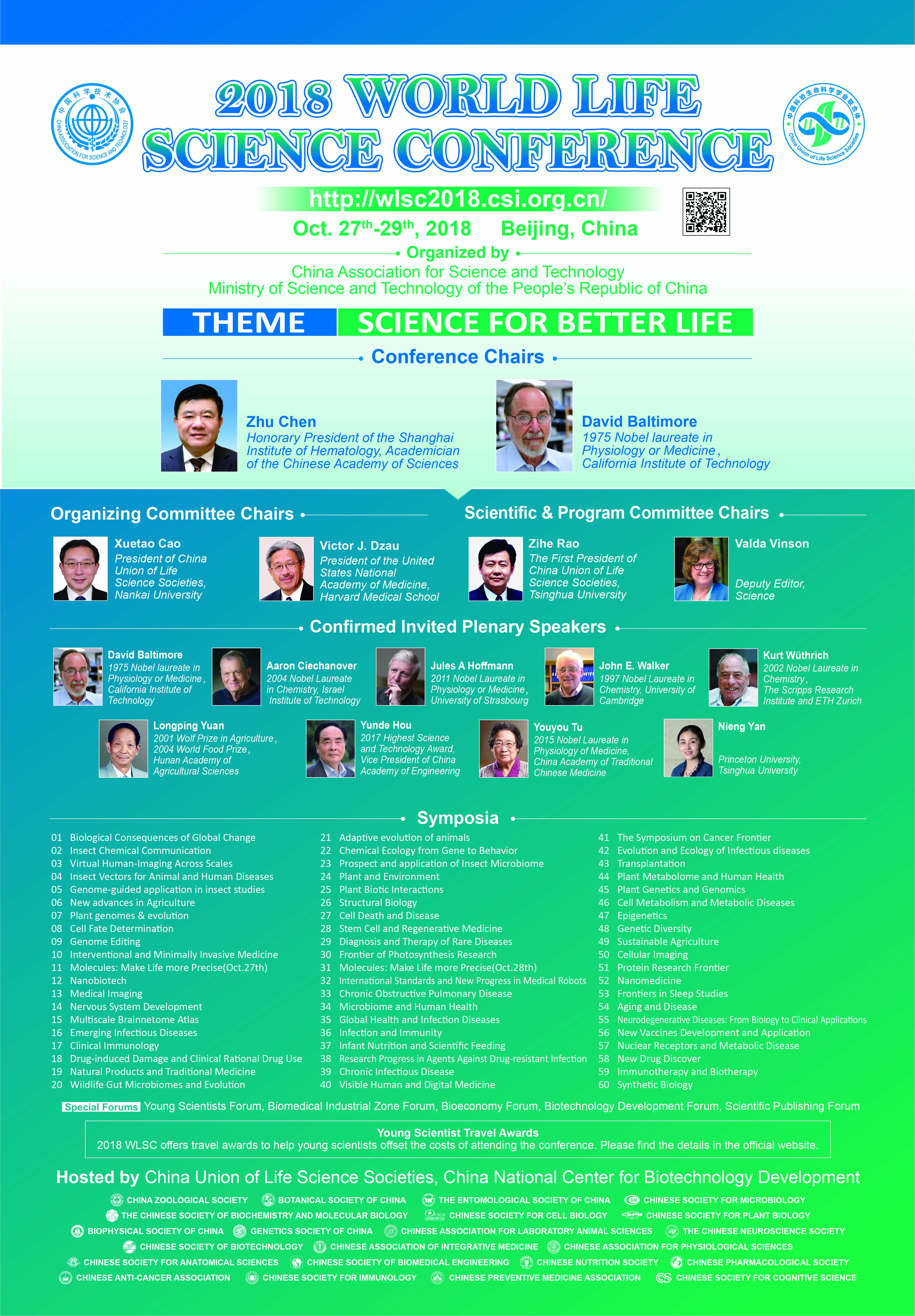 鍦ㄦ垚鍔熶妇鍔炰笂涓灞婁笘鐣岀敓鍛界瀛﹀ぇ浼氬熀纭涓婏紝鐢变腑鍥界瀛︽妧鏈崗浼氥佺瀛︽妧鏈儴涓诲姙锛屼腑鍥界鍗忕敓鍛界瀛﹀浼氳仈鍚堜綋銆佷腑鍥界敓鐗╂妧鏈彂灞曚腑蹇冩壙鍔炵殑 2018 涓栫晫鐢熷懡绉戝澶т細瀹氫簬 10 鏈 27 鏃ヨ嚦 10 鏈 29 鏃ュ湪鍖椾含鍥藉浼氳涓績鍙紑銆傚ぇ浼氬皢鍥寸粫鍖诲涓庡仴搴枫佸啘涓氫笌椋熷搧瀹夊叏銆佺幆澧冪瀛︺佸崼鐢熸斂绛栫瓑棰嗗煙锛屽紑灞曟洿楂樻按骞崇殑瀛︽湳浜ゆ祦鍜屾渶鏂版垚鏋滃睍绀猴紝鐬勫噯鐢熷懡绉戝閲嶅ぇ闇姹傦紝杩涗竴姝ュ姞寮轰氦娴佷笌鍚堜綔锛岀浉浜掑熼壌锛屼互鏇村绉戝绐佺牬鍜屽垱鏂扮Н鏋佸簲瀵逛汉绫荤敓瀛樺彂灞曢潰涓寸殑鍏卞悓鎸戞垬銆傚叏鍥戒汉澶у父濮斿壇濮斿憳闀块檲绔哄拰璇鸿礉灏旂敓鐞嗗鎴栧尰瀛﹀鑾峰緱鑰 David Baltimore 鏁欐巿灏嗗叡鍚屾媴浠诲ぇ浼氫富甯